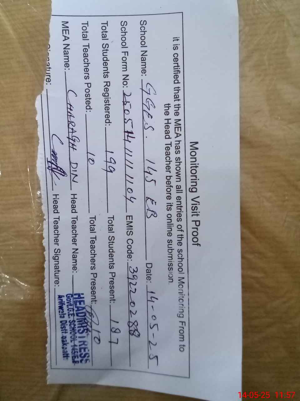 | Attendance Register | Head Teacher | MEA with School | Visit Proof |