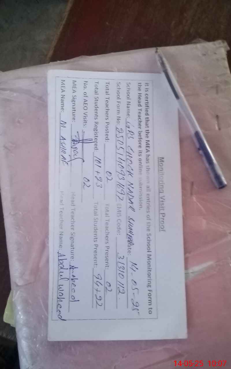 | EMIS Code: 31310112 | Name of School: GPS CHOWK NADIR SHAHEED (After Noon) | |||