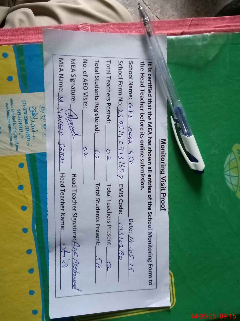 | Attendance Register | Head Teacher | MEA with School | Visit Proof |