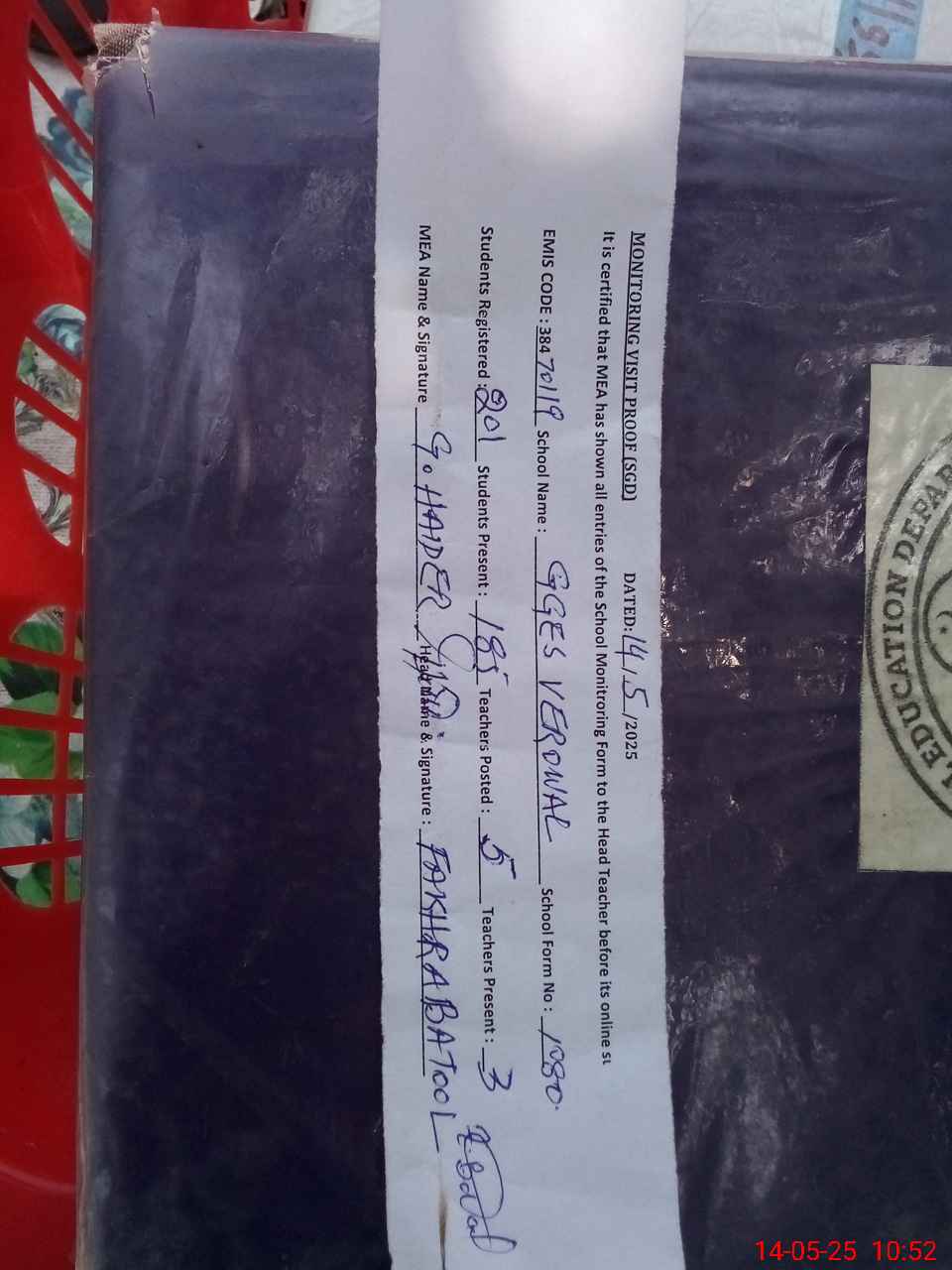 | Certified that this School was Inspected by the Undersigned MEA/DMO Today and the Information Stated Above is as Per Record. | |||||