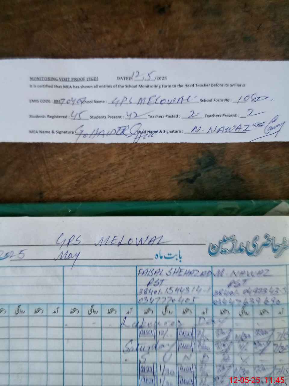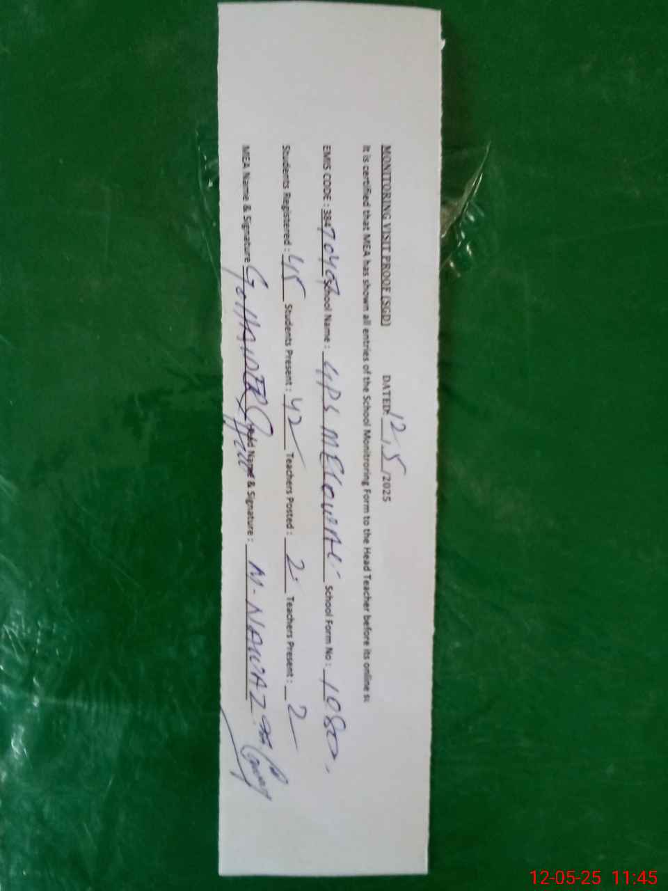 | Attendance Register | Head Teacher | MEA with School | Visit Proof |