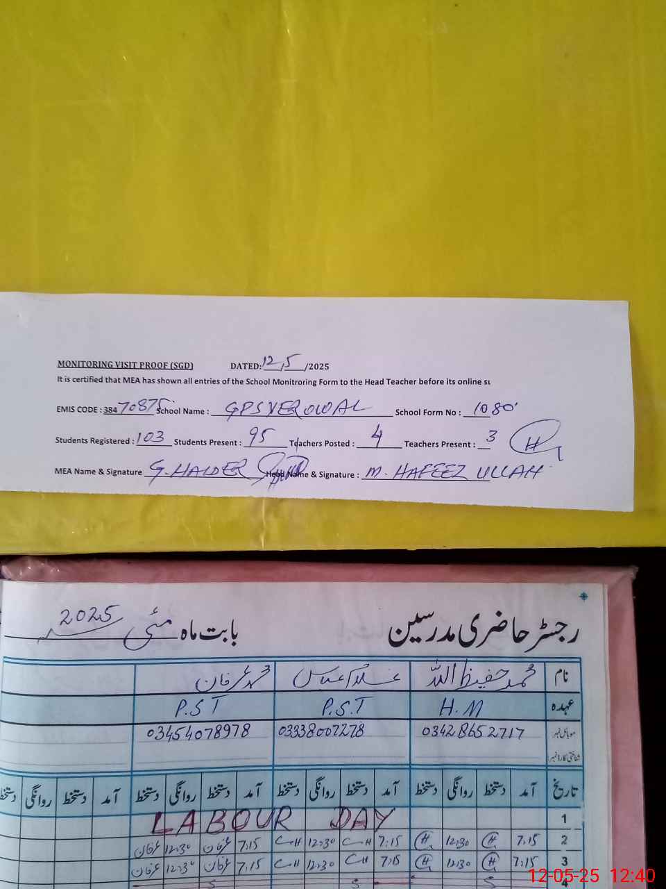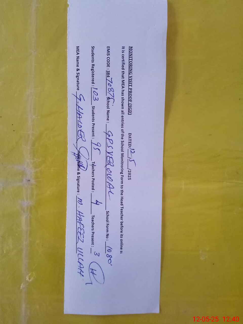 | Attendance Register | Head Teacher | MEA with School | Visit Proof |