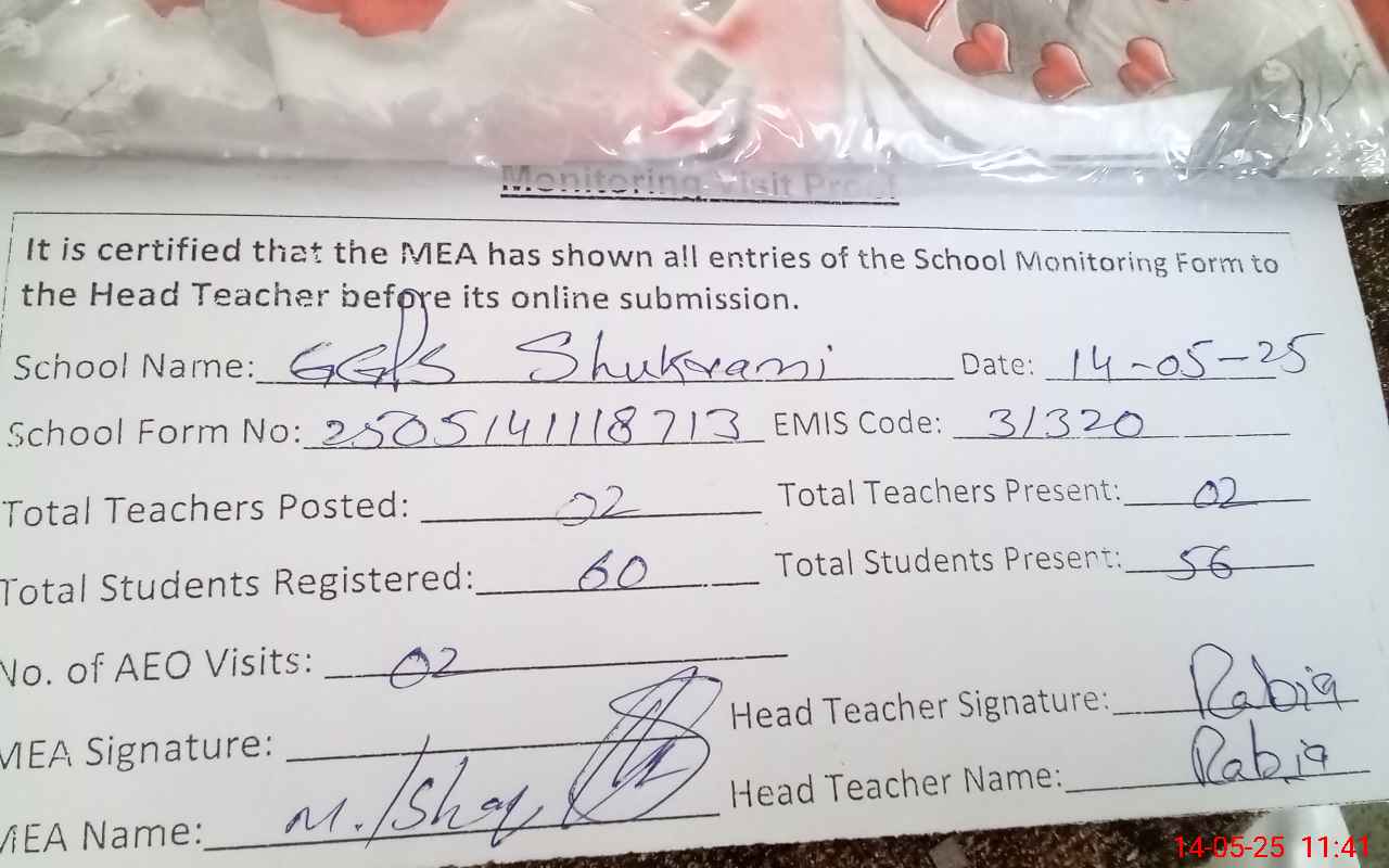 | Attendance Register | Head Teacher | MEA with School | Visit Proof |