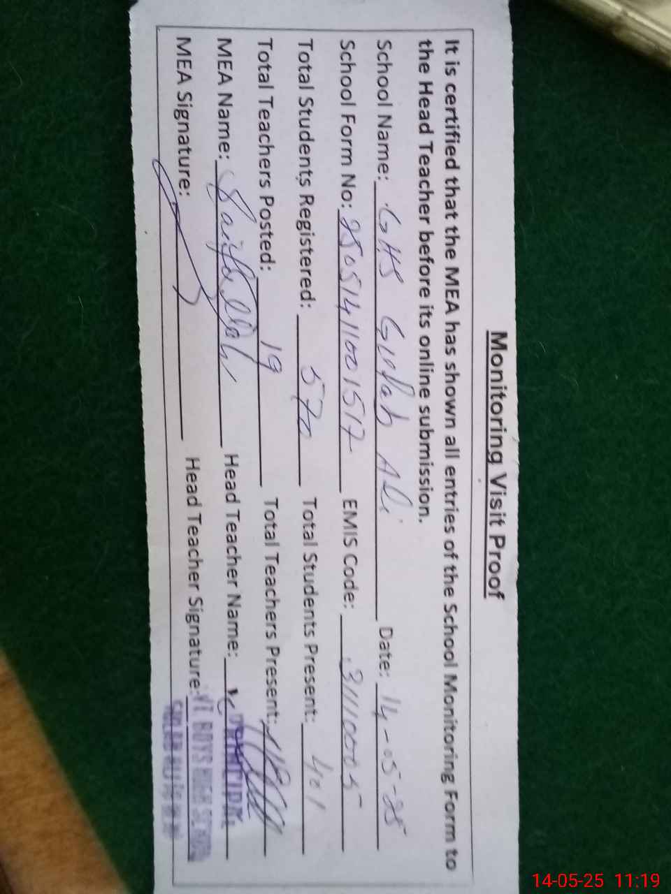 | EMIS Code: 31110005 | Name of School: GHS GULAB ALI | |||