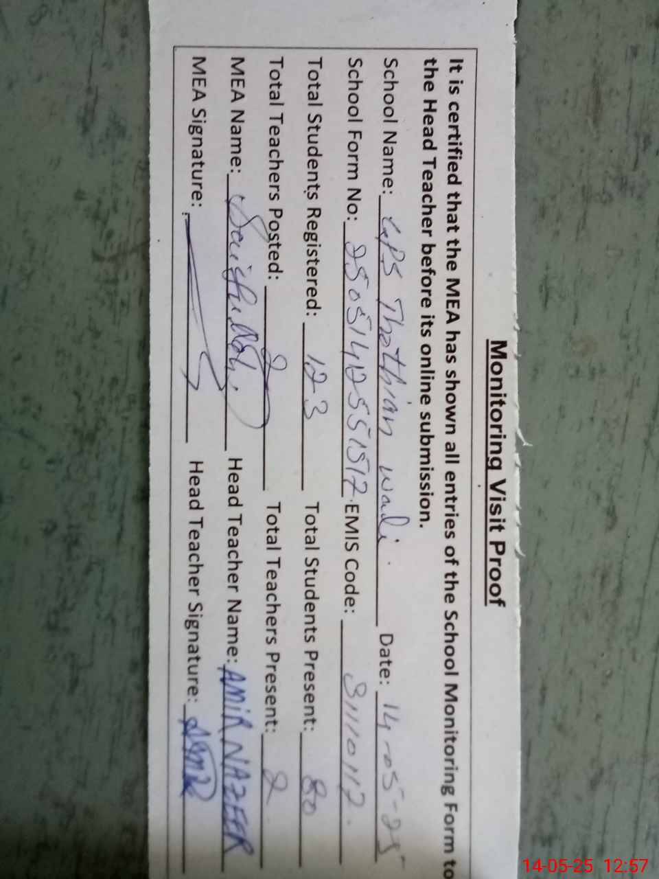 | Attendance Register | Head Teacher | MEA with School | Visit Proof |