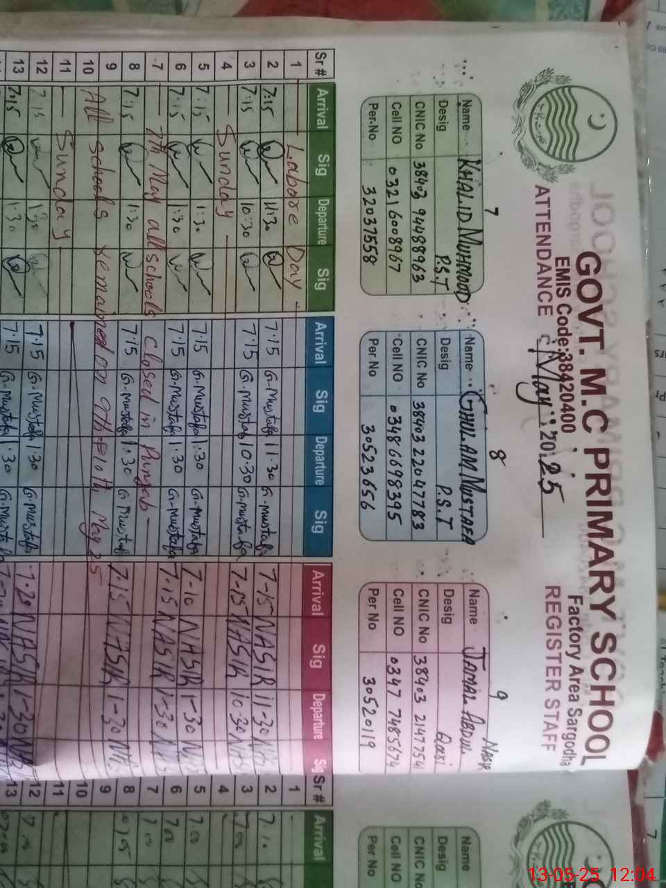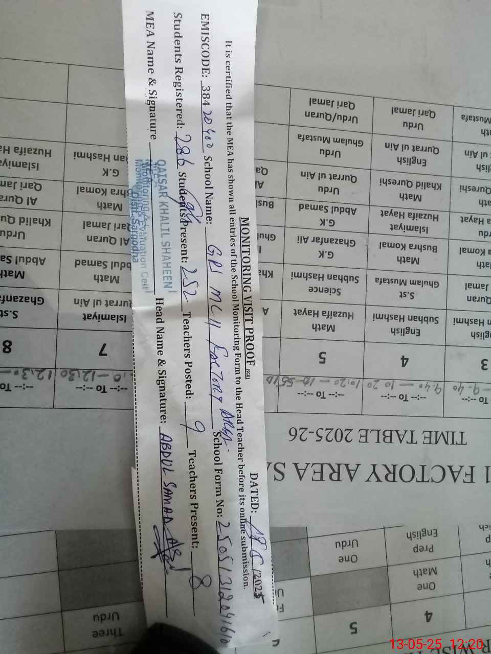 | EMIS Code: 38420400 | Name of School: GPS MC NO. 11 FACTORY AREA SARGODHA | |||