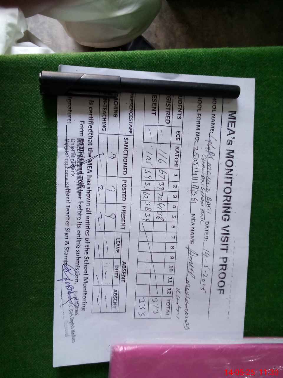 | Attendance Register | Head Teacher | MEA with School | Visit Proof |