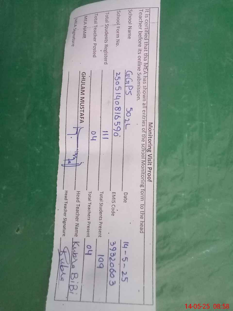 | Attendance Register | Head Teacher | MEA with School | Visit Proof |