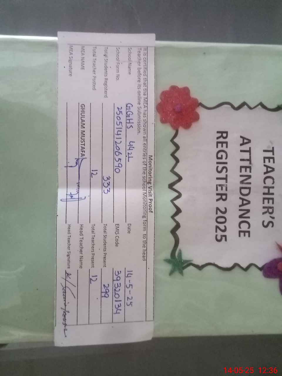 | Attendance Register | Head Teacher | MEA with School | Visit Proof |