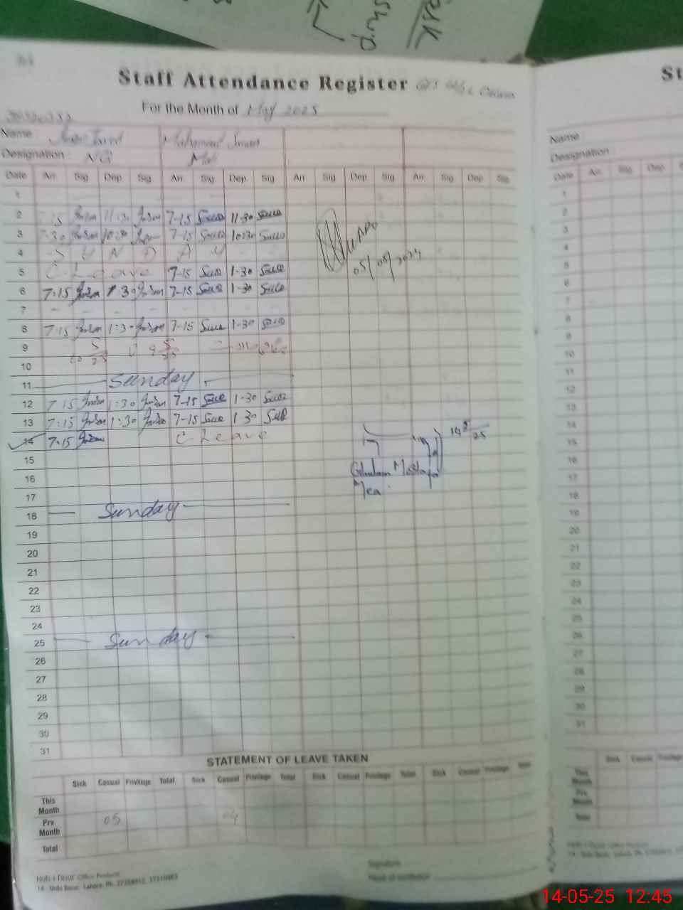 | CNIC | Full Name | Designation | R/C | Absence During Last Calender Month |