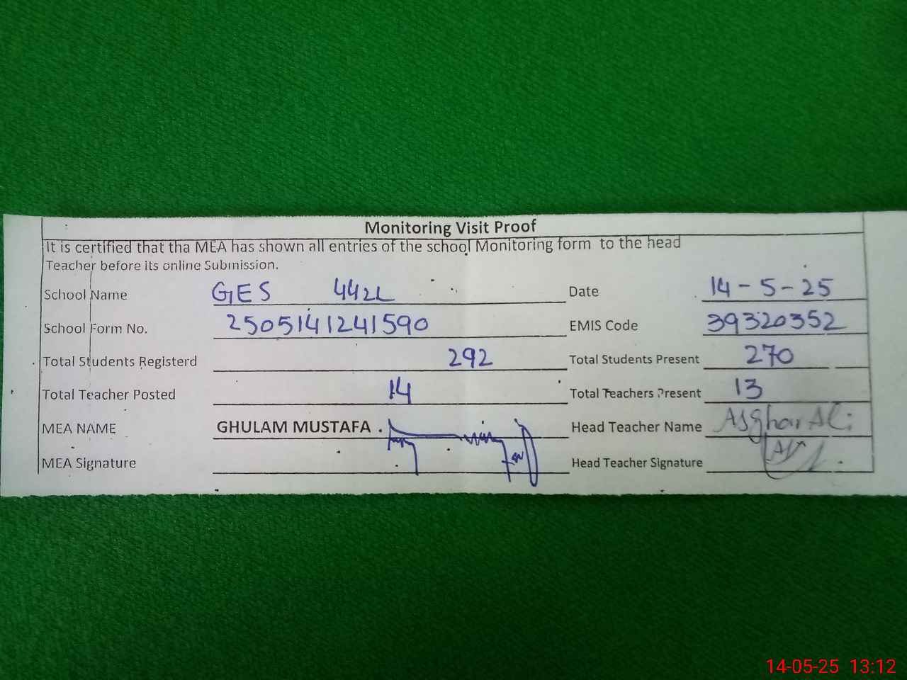 | Attendance Register | Head Teacher | MEA with School | Visit Proof |