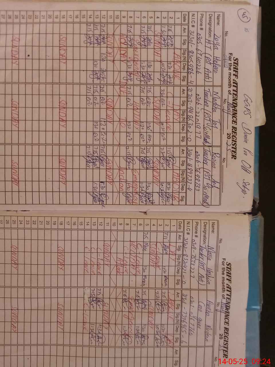 | CNIC | Full Name | Designation | R/C | Absence During Last Calender Month |