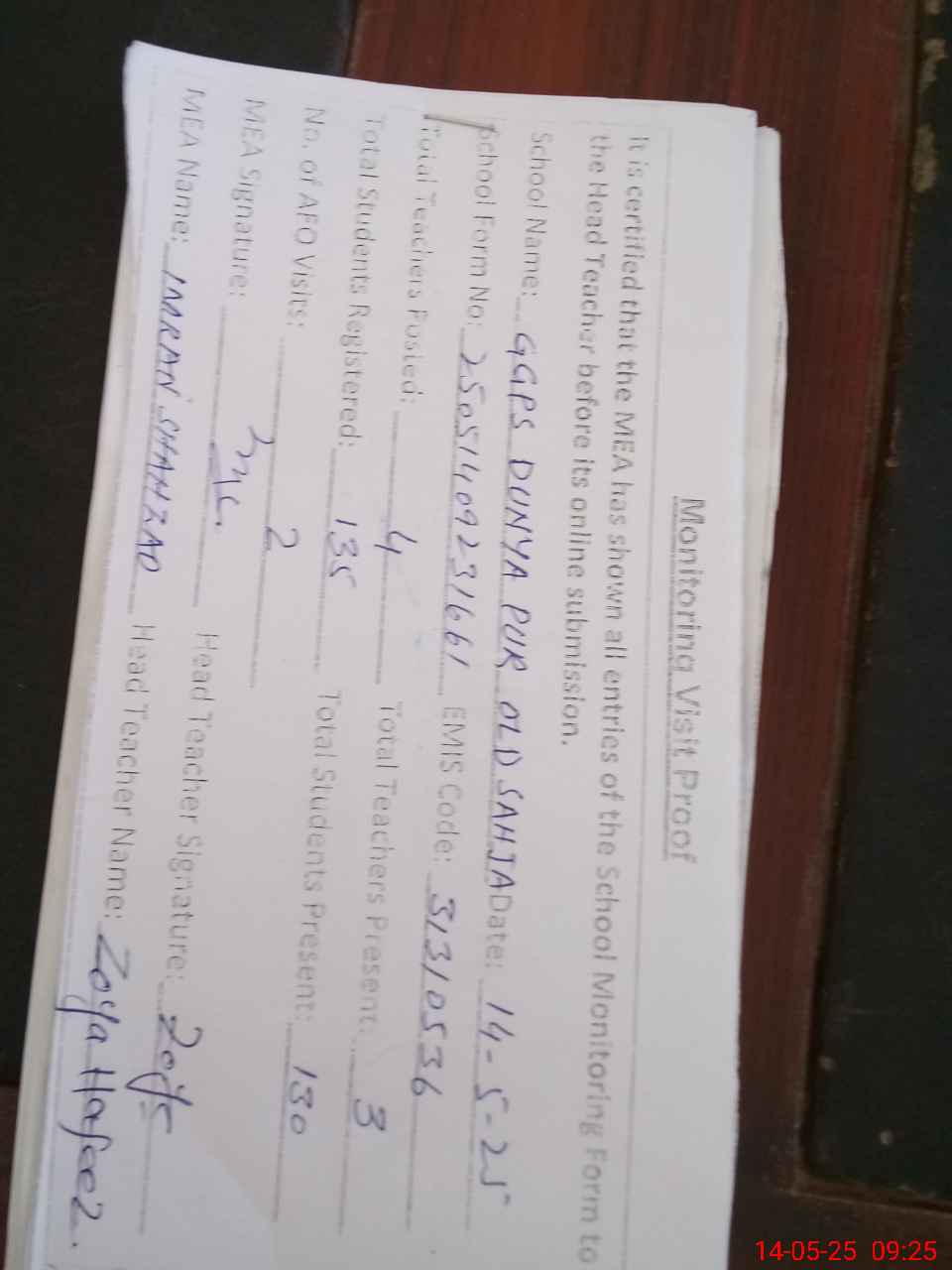 | Attendance Register | Head Teacher | MEA with School | Visit Proof |
