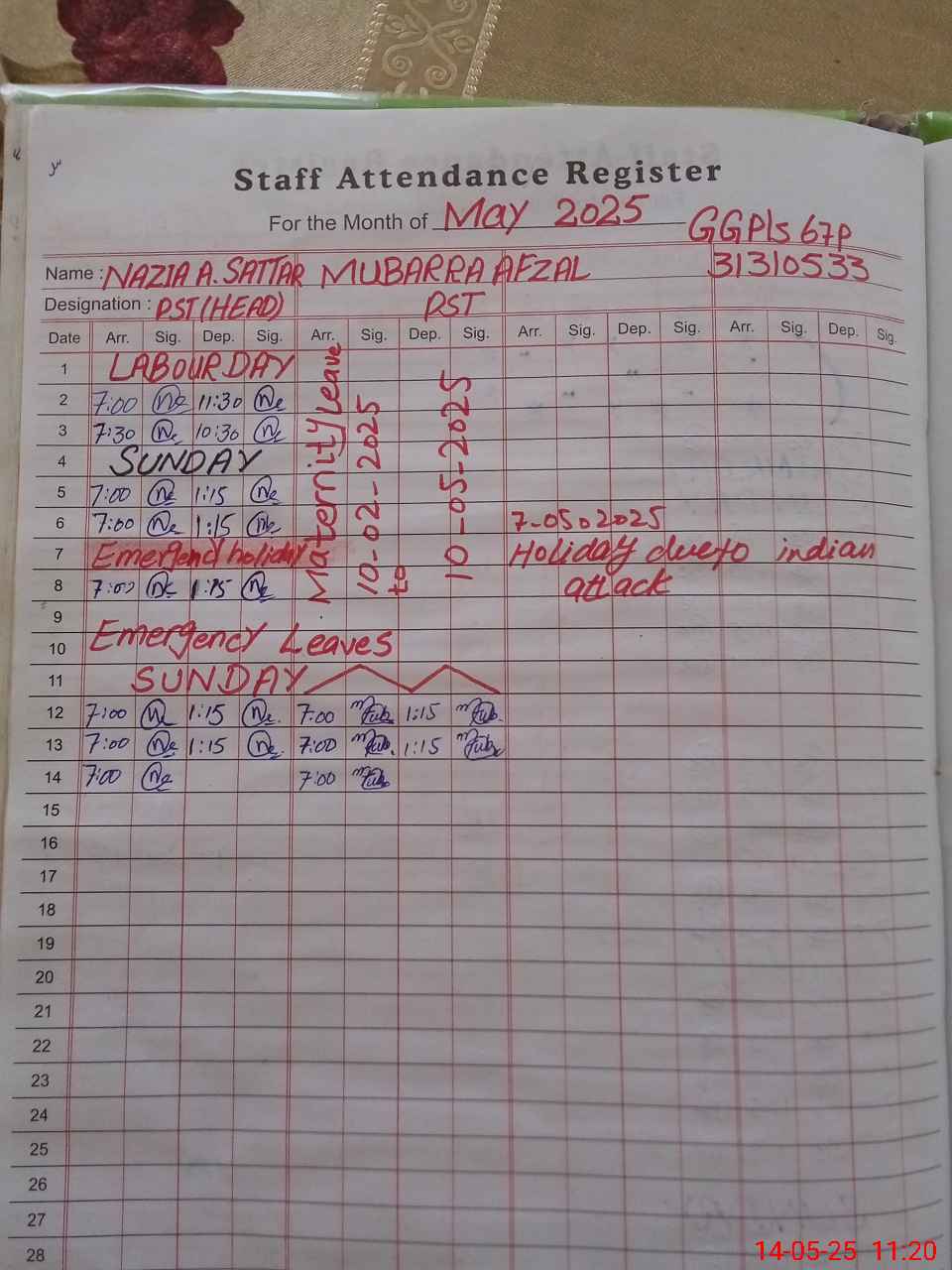 | CNIC | Full Name | Designation | R/C | Absence During Last Calender Month |