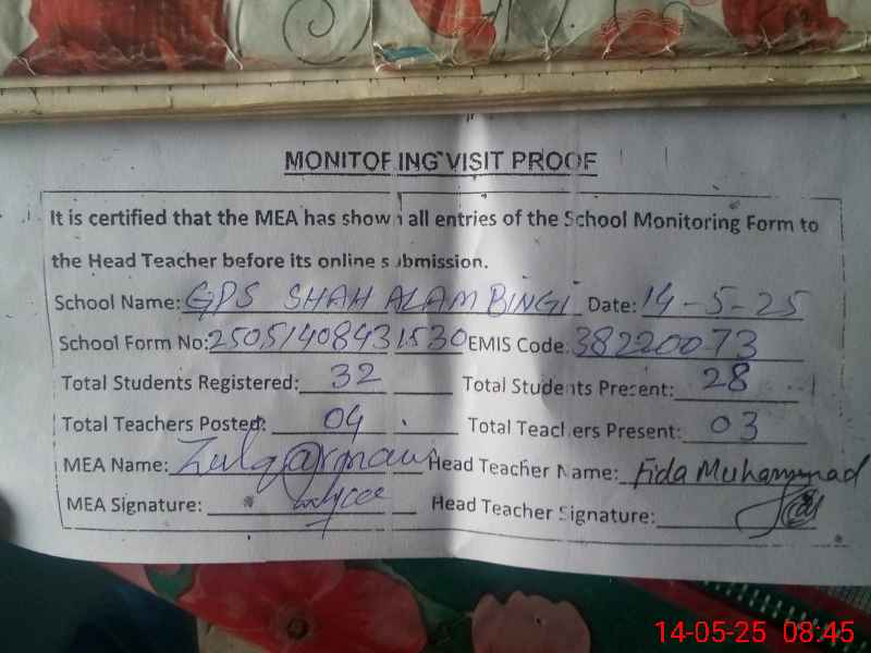 | EMIS Code: 38220073 | Name of School: GPS SHAH ALAM BINGI | |||