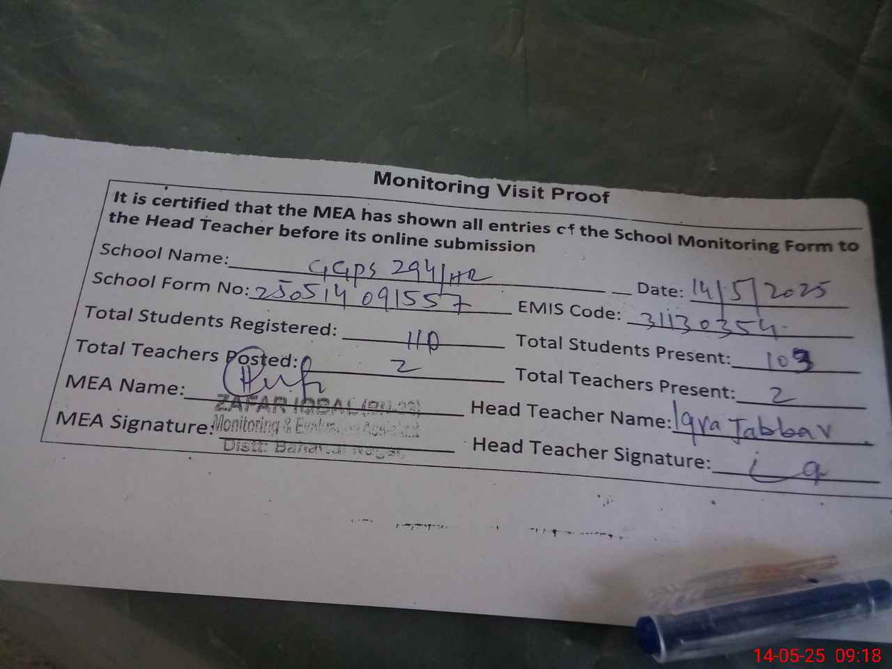 | EMIS Code: 31130354 | Name of School: GGPS CHAK NO 294 HR | |||