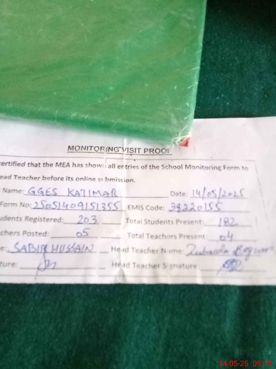 | Attendance Register | Head Teacher | MEA with School | Visit Proof |