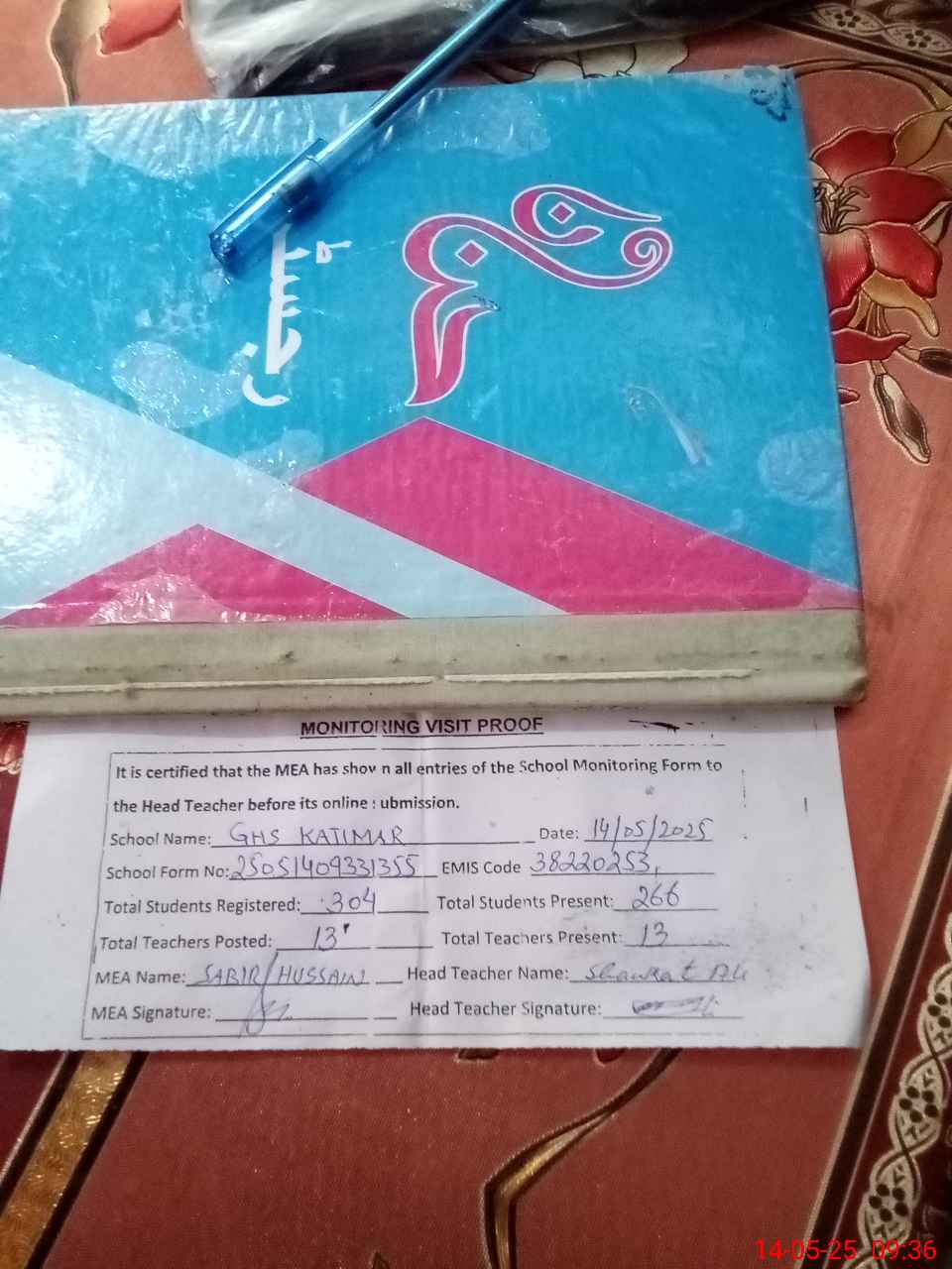 | Attendance Register | Head Teacher | MEA with School | Visit Proof |