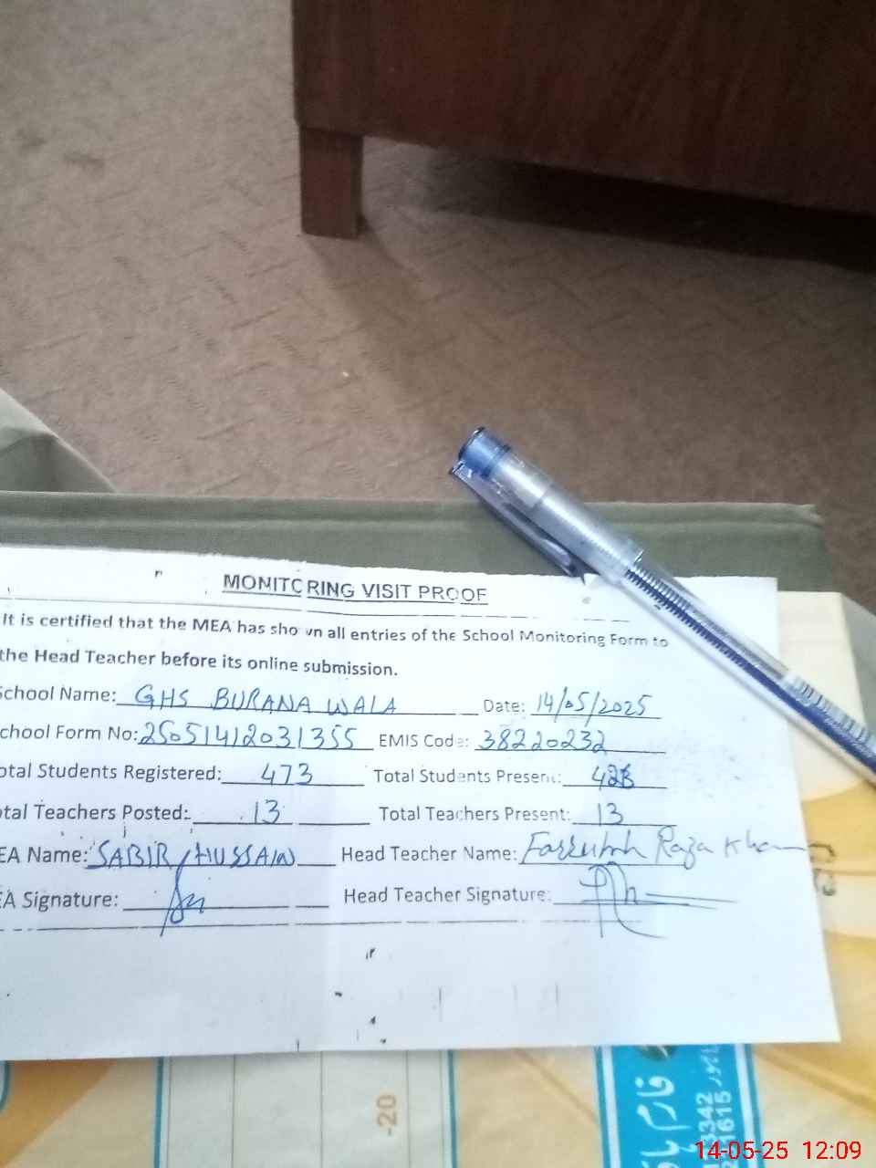 | Attendance Register | Head Teacher | MEA with School | Visit Proof |