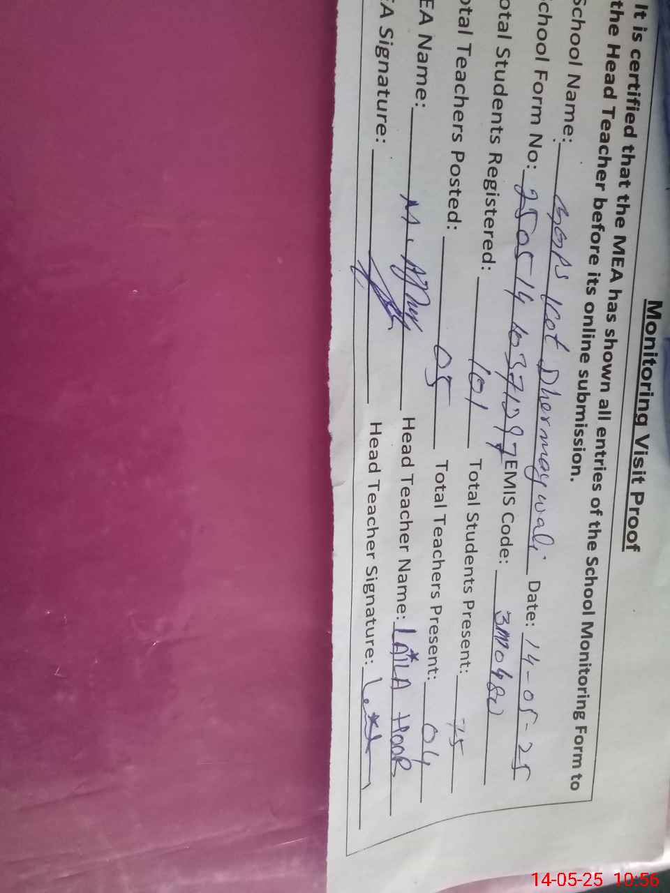 | Attendance Register | Head Teacher | MEA with School | Visit Proof |