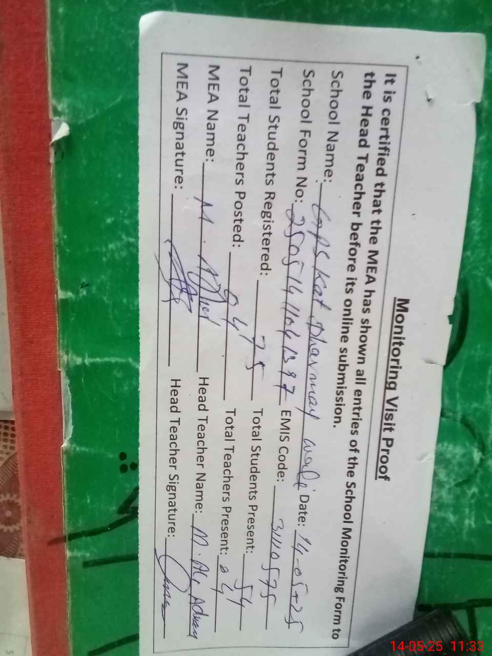| Attendance Register | Head Teacher | MEA with School | Visit Proof |