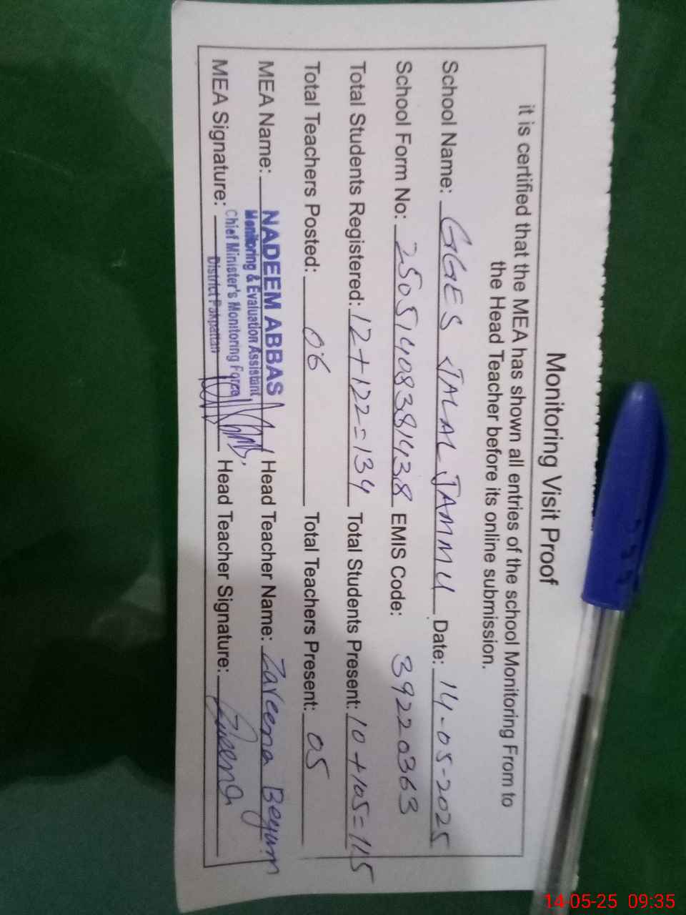 | Attendance Register | Head Teacher | MEA with School | Visit Proof |