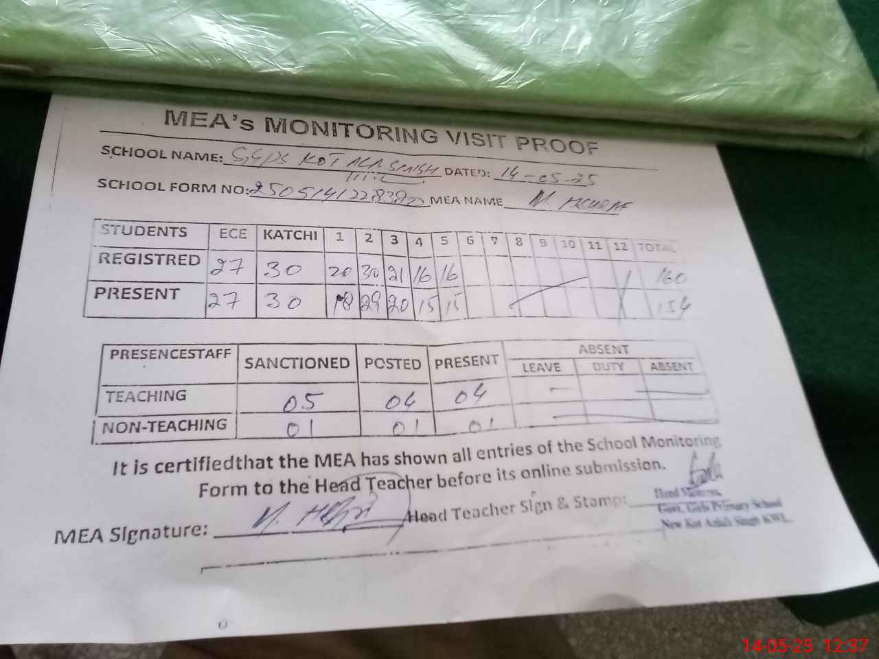 | Attendance Register | Head Teacher | MEA with School | Visit Proof |