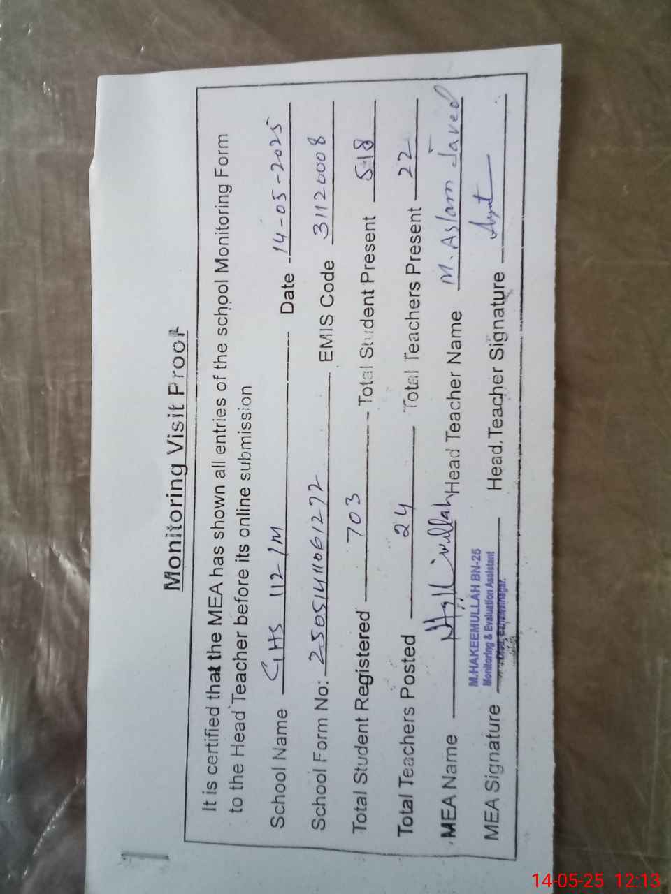 | Attendance Register | Head Teacher | MEA with School | Visit Proof |