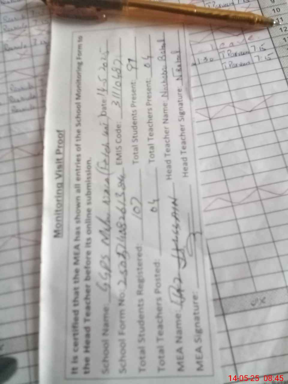 | Attendance Register | Head Teacher | MEA with School | Visit Proof |