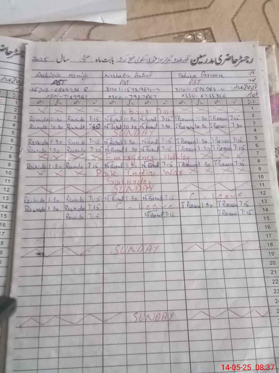 | CNIC | Full Name | Designation | R/C | Absence During Last Calender Month |