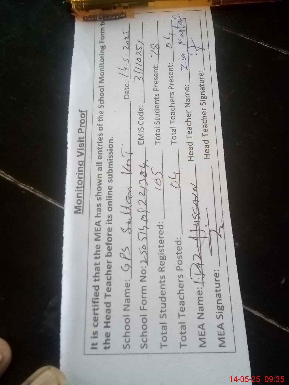 | Attendance Register | Head Teacher | MEA with School | Visit Proof |