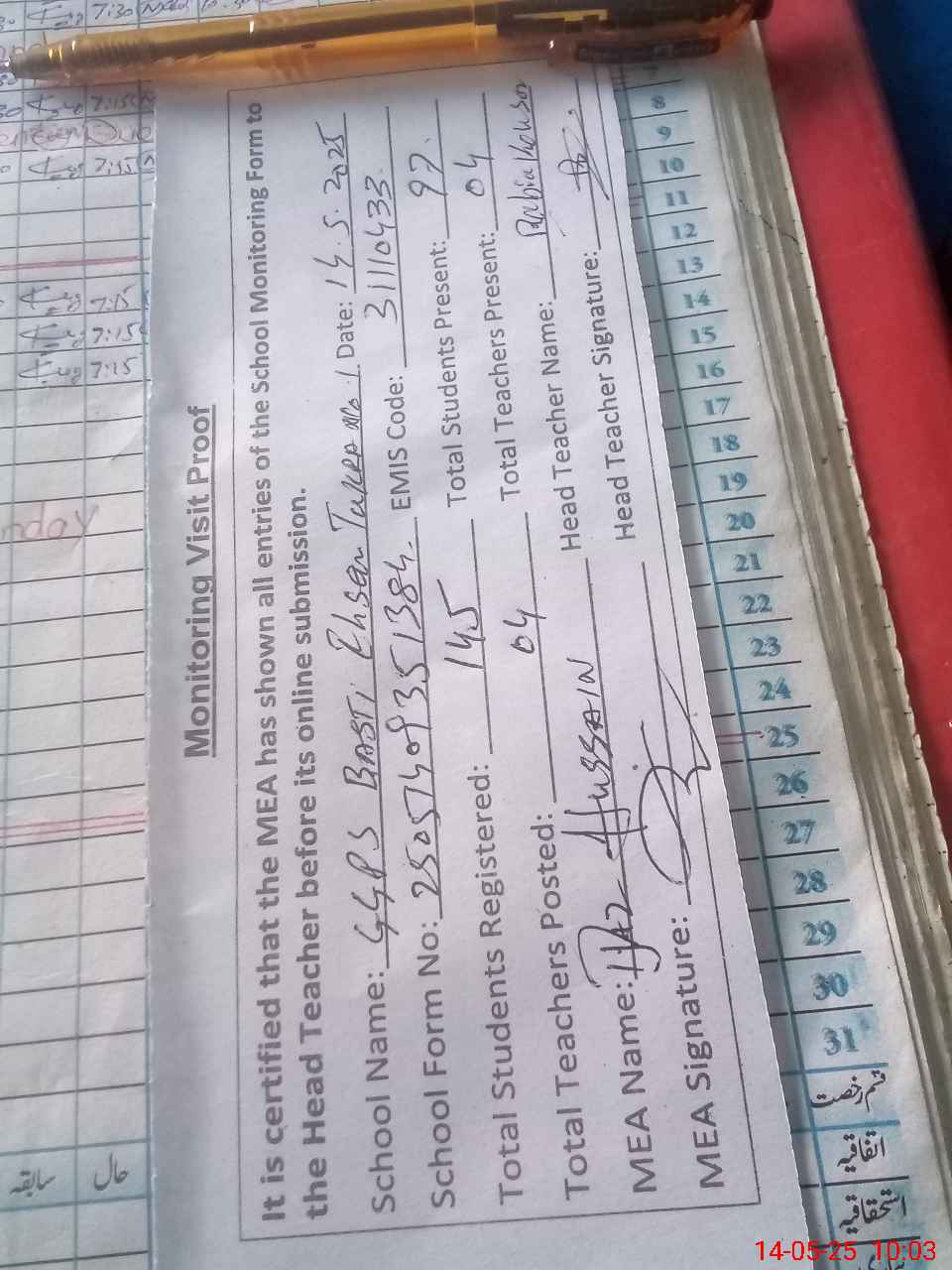| Attendance Register | Head Teacher | MEA with School | Visit Proof |