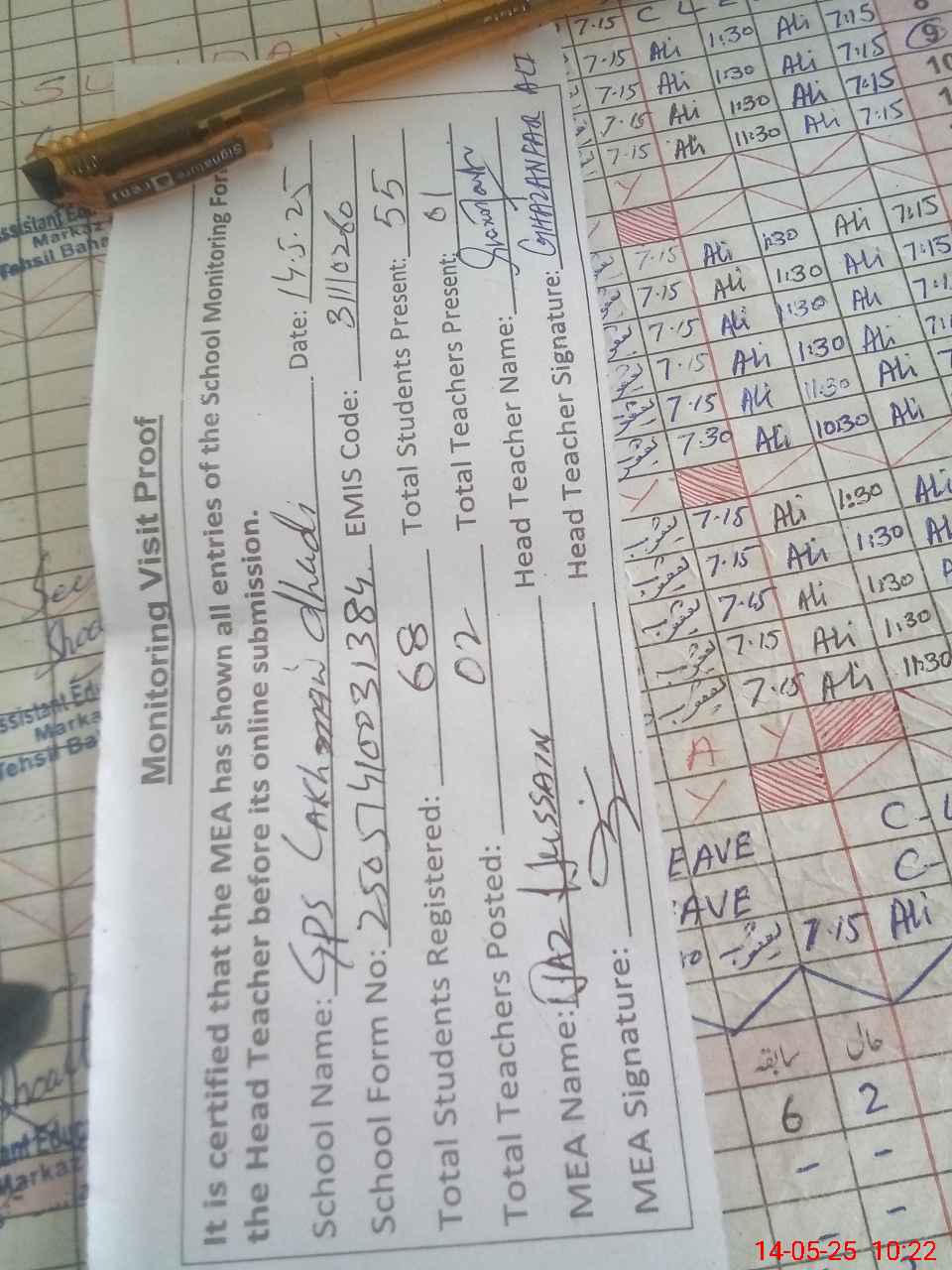 | Attendance Register | Head Teacher | MEA with School | Visit Proof |