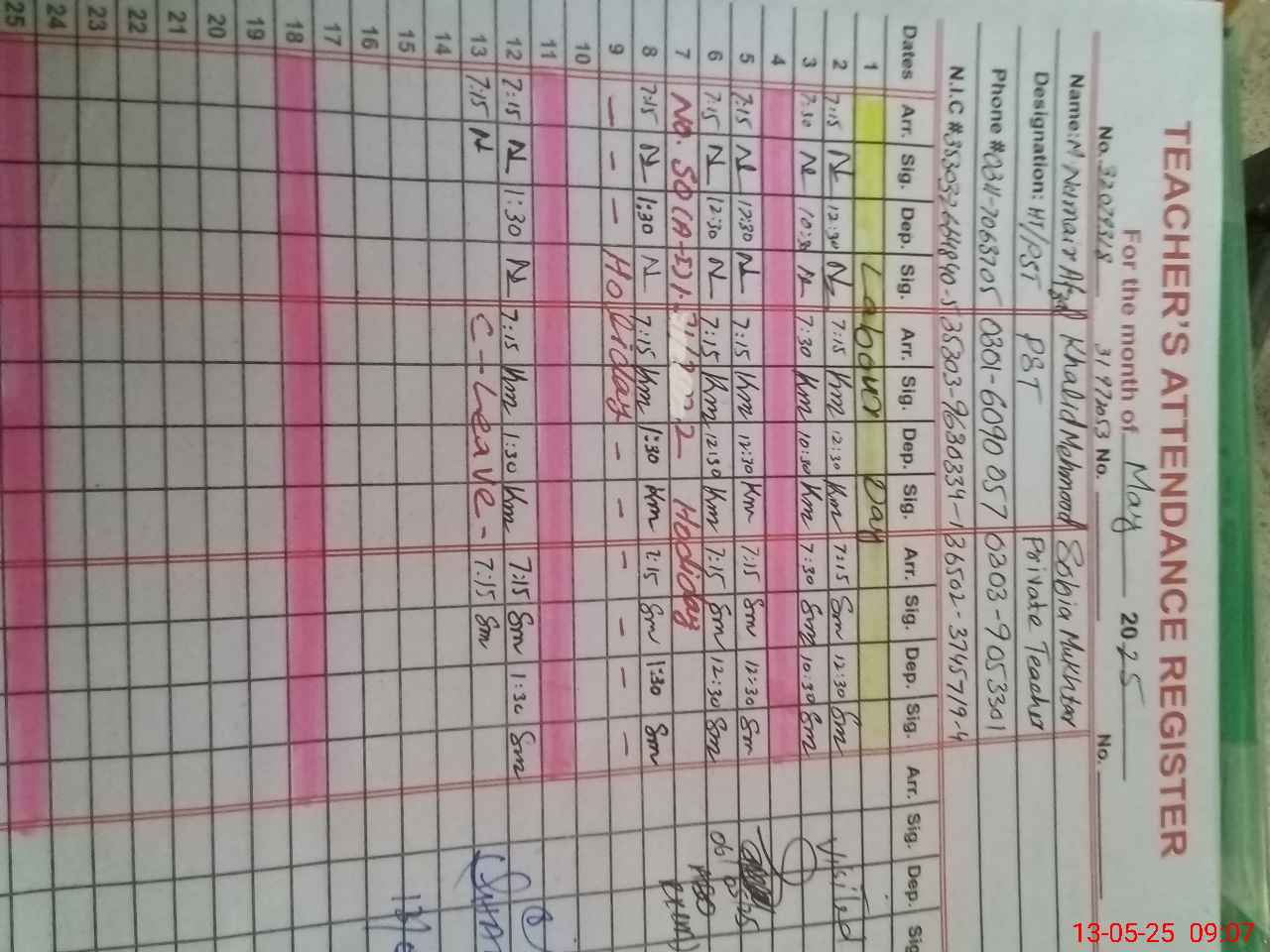 | CNIC | Full Name | Designation | R/C | Absence During Last Calender Month |