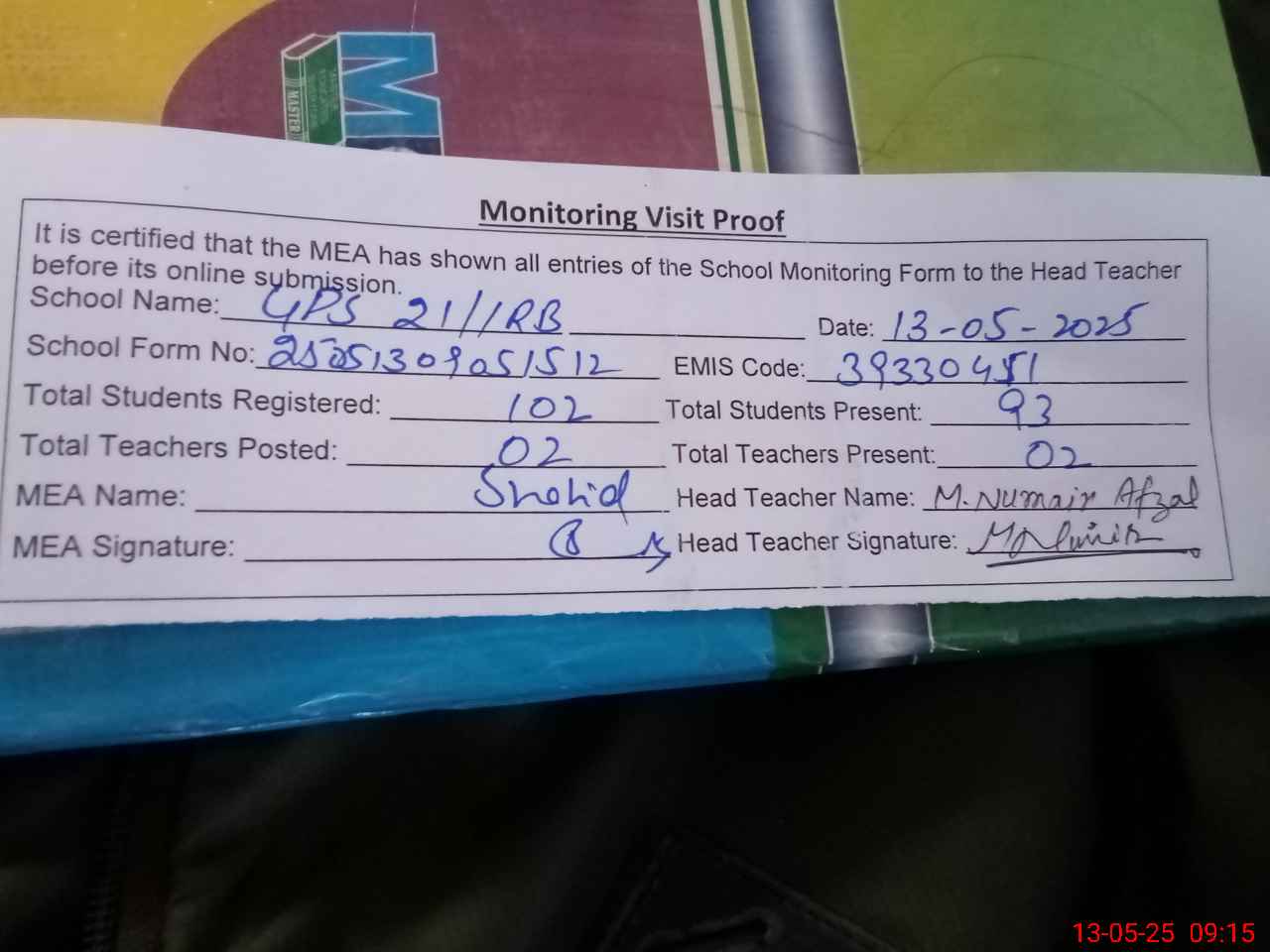 | Attendance Register | Head Teacher | MEA with School | Visit Proof |
