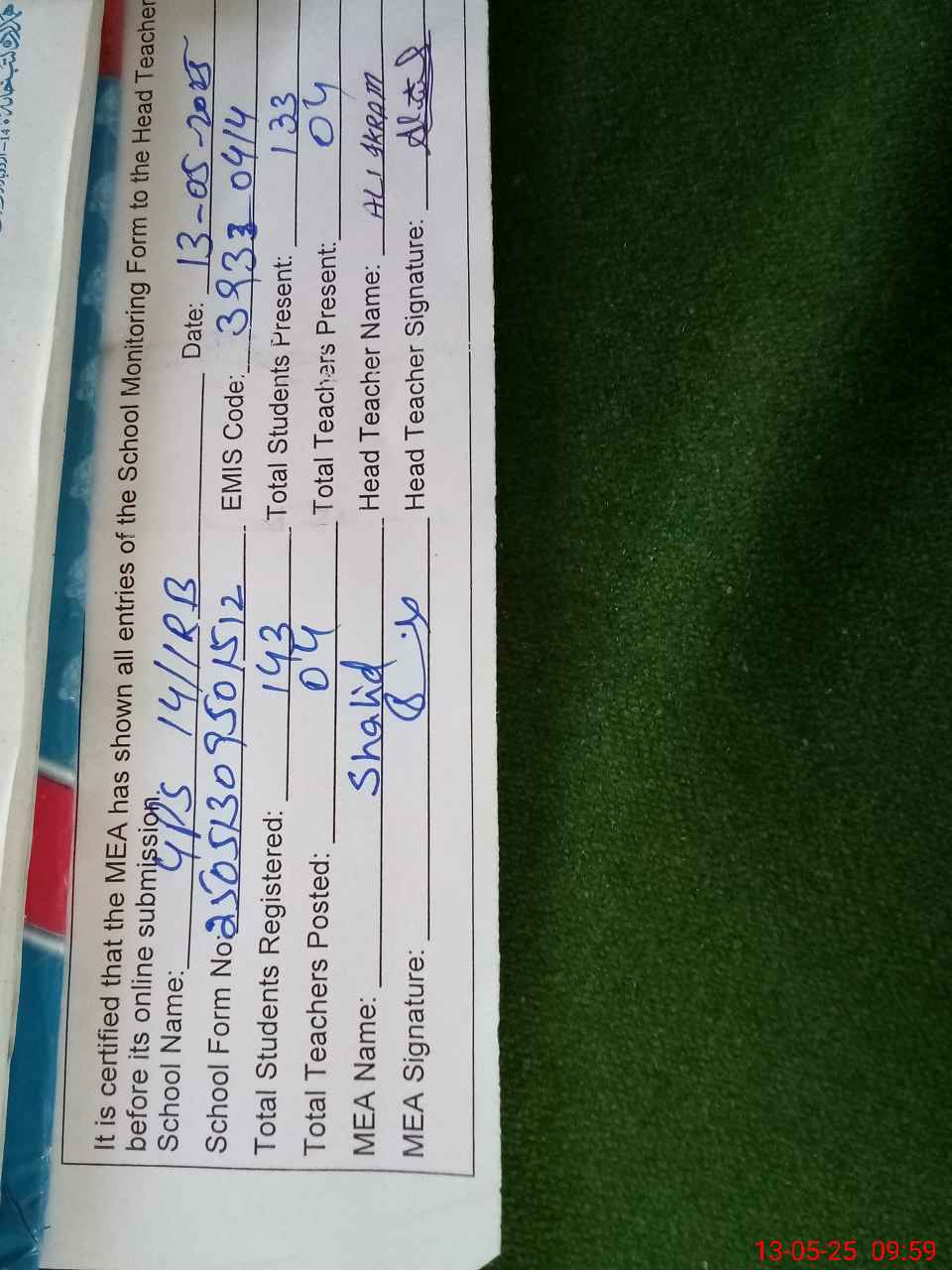 | Certified that this School was Inspected by the Undersigned MEA/DMO Today and the Information Stated Above is as Per Record. | |||||