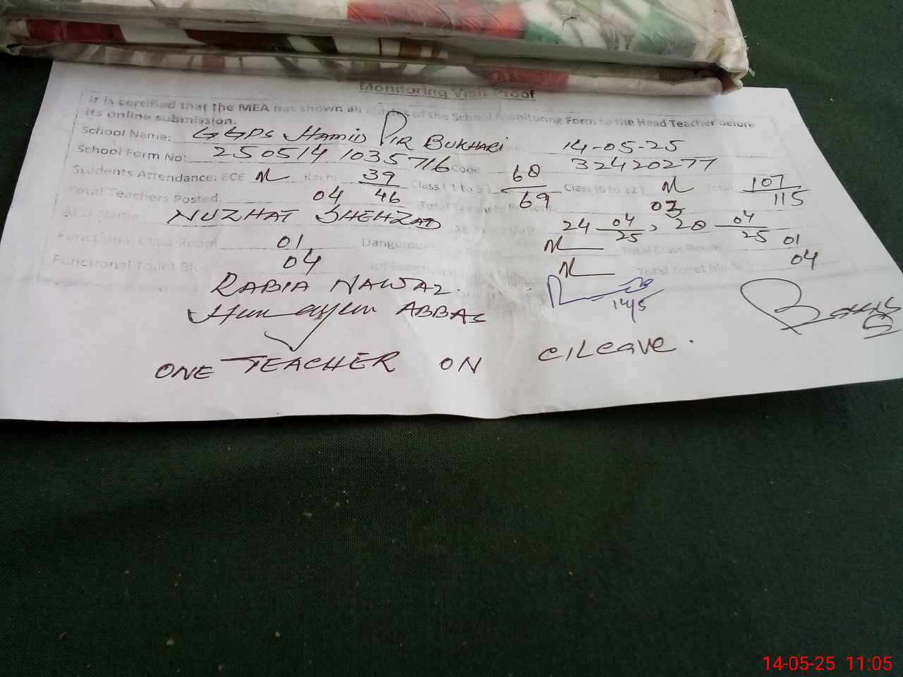 | Remarks (Use Separate Page if Required): One teacher on casual leave over All cleaness good | |||||