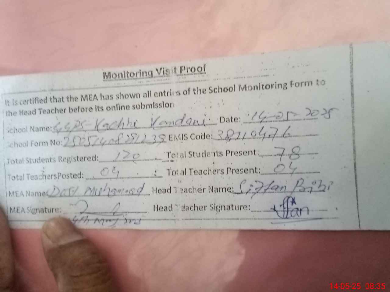 | Attendance Register | Head Teacher | MEA with School | Visit Proof |