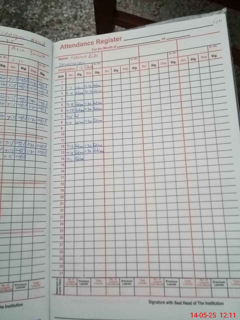 | CNIC | Full Name | Designation | R/C | Absence During Last Calender Month |