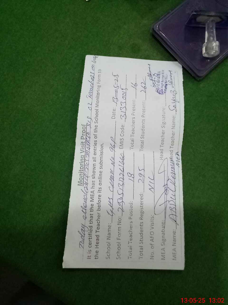 | Attendance Register | Head Teacher | MEA with School | Visit Proof |