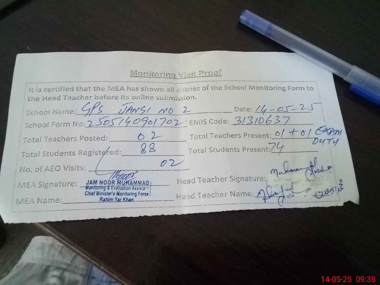 | Attendance Register | Head Teacher | MEA with School | Visit Proof |