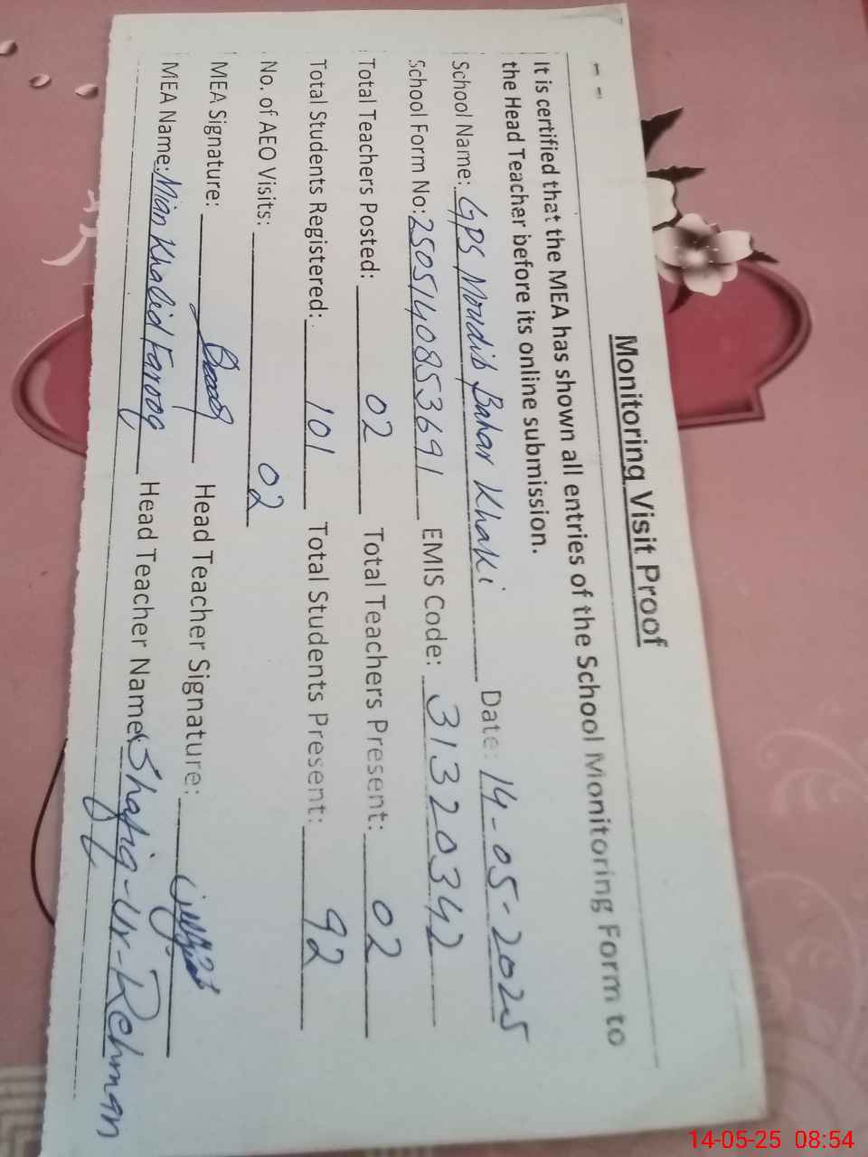 | Attendance Register | Head Teacher | MEA with School | Visit Proof |