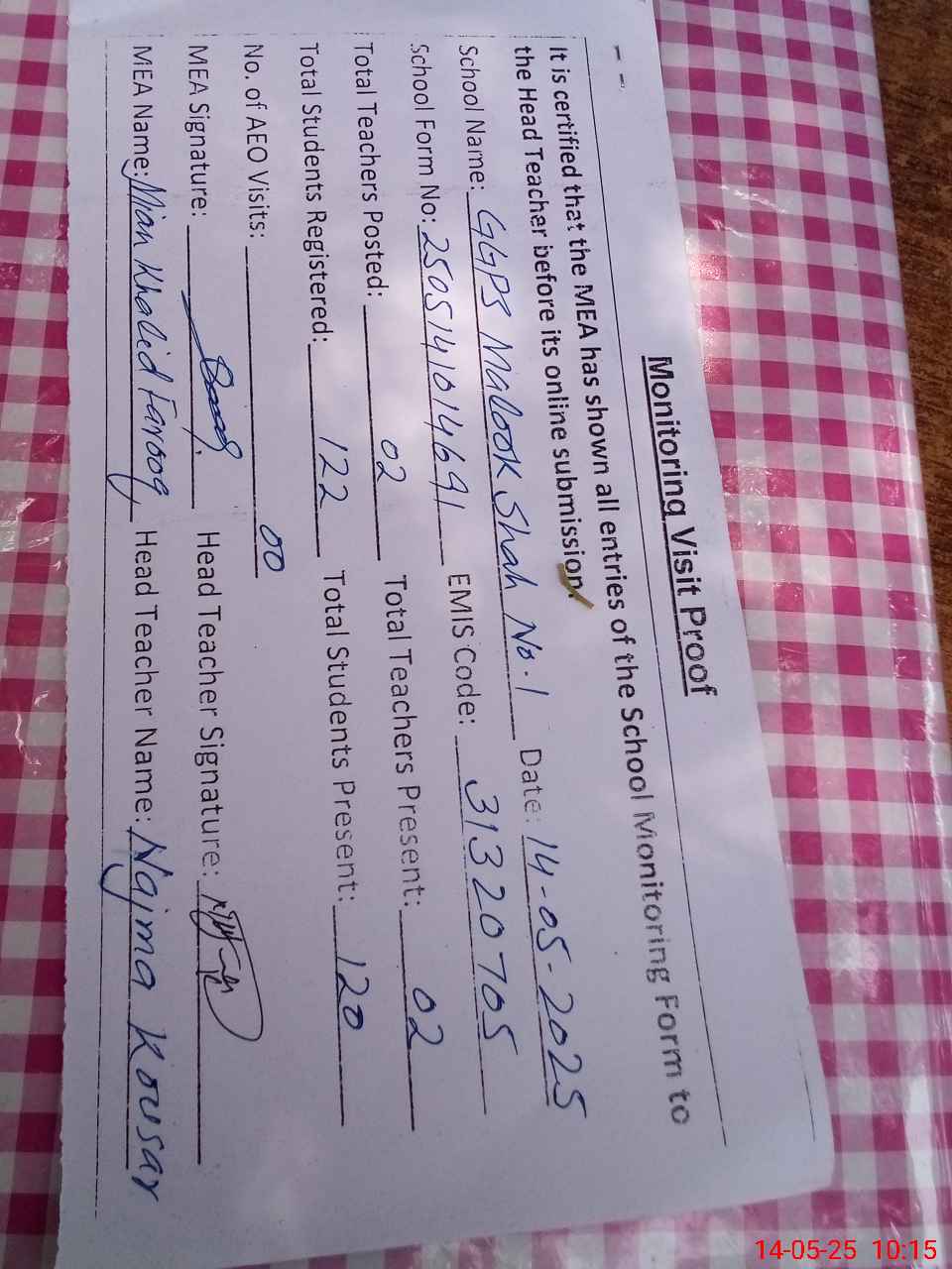 | Attendance Register | Head Teacher | MEA with School | Visit Proof |