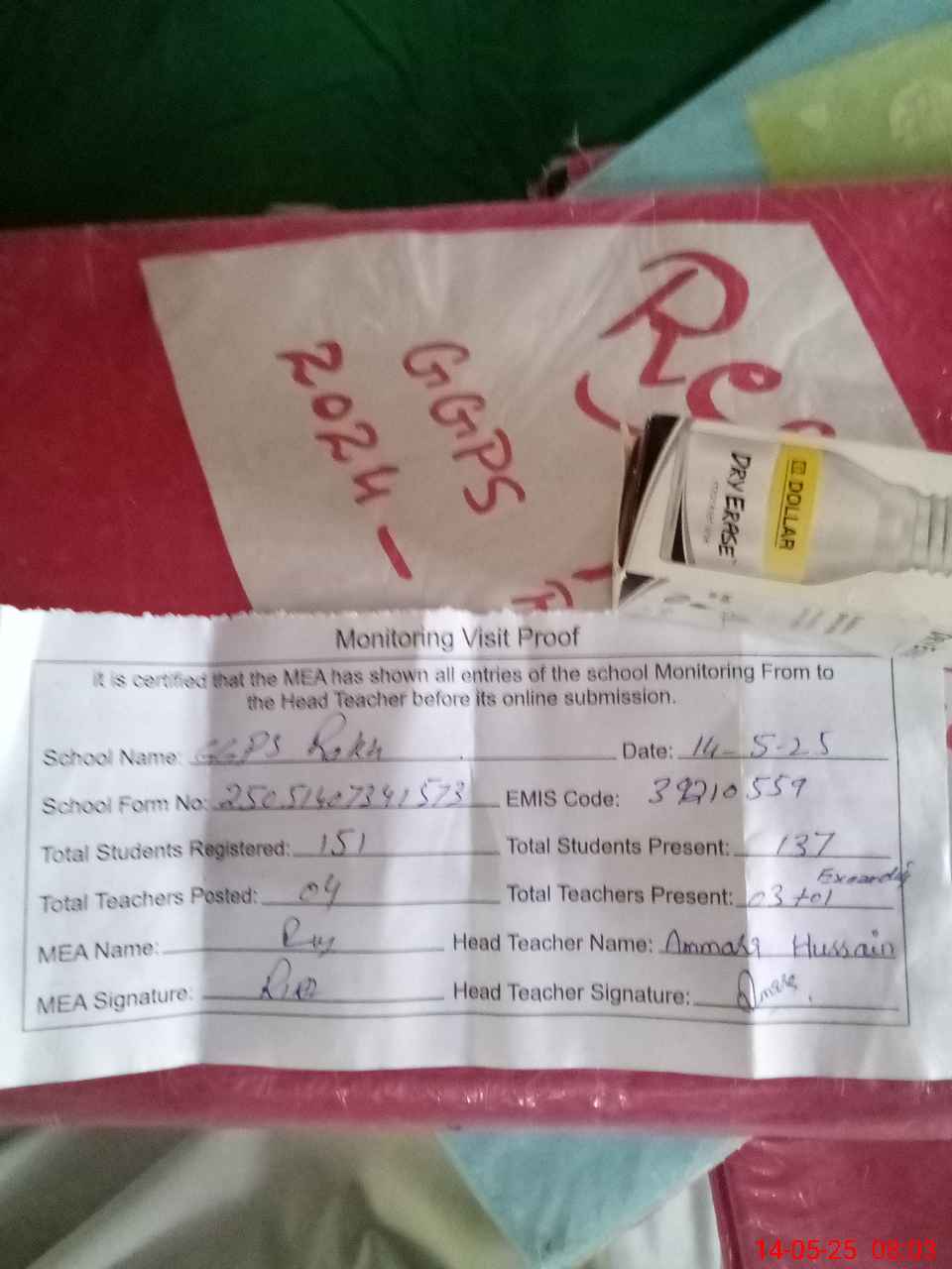 | Attendance Register | Head Teacher | MEA with School | Visit Proof |