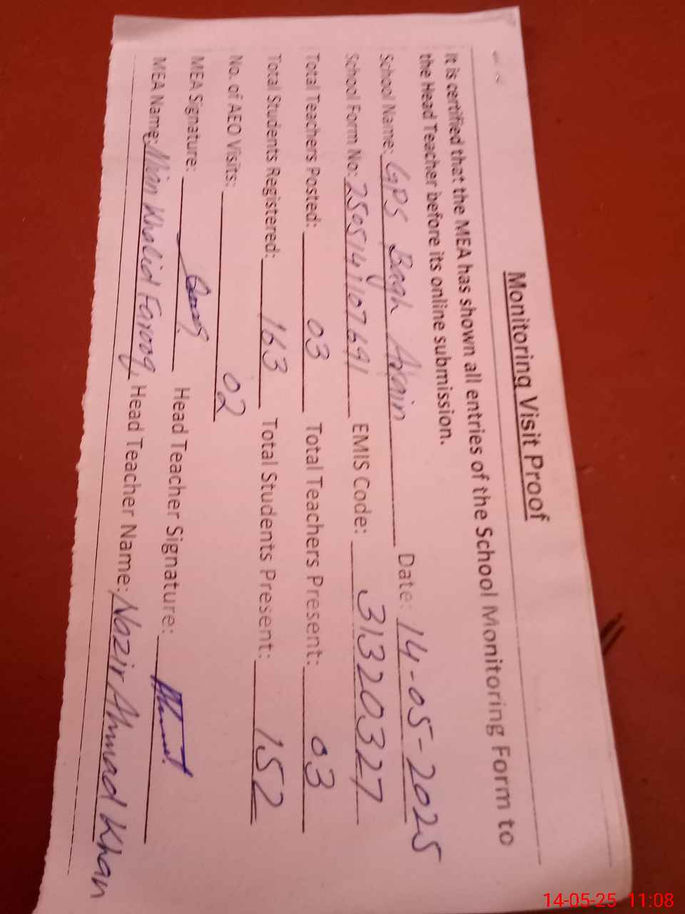 | Attendance Register | Head Teacher | MEA with School | Visit Proof |