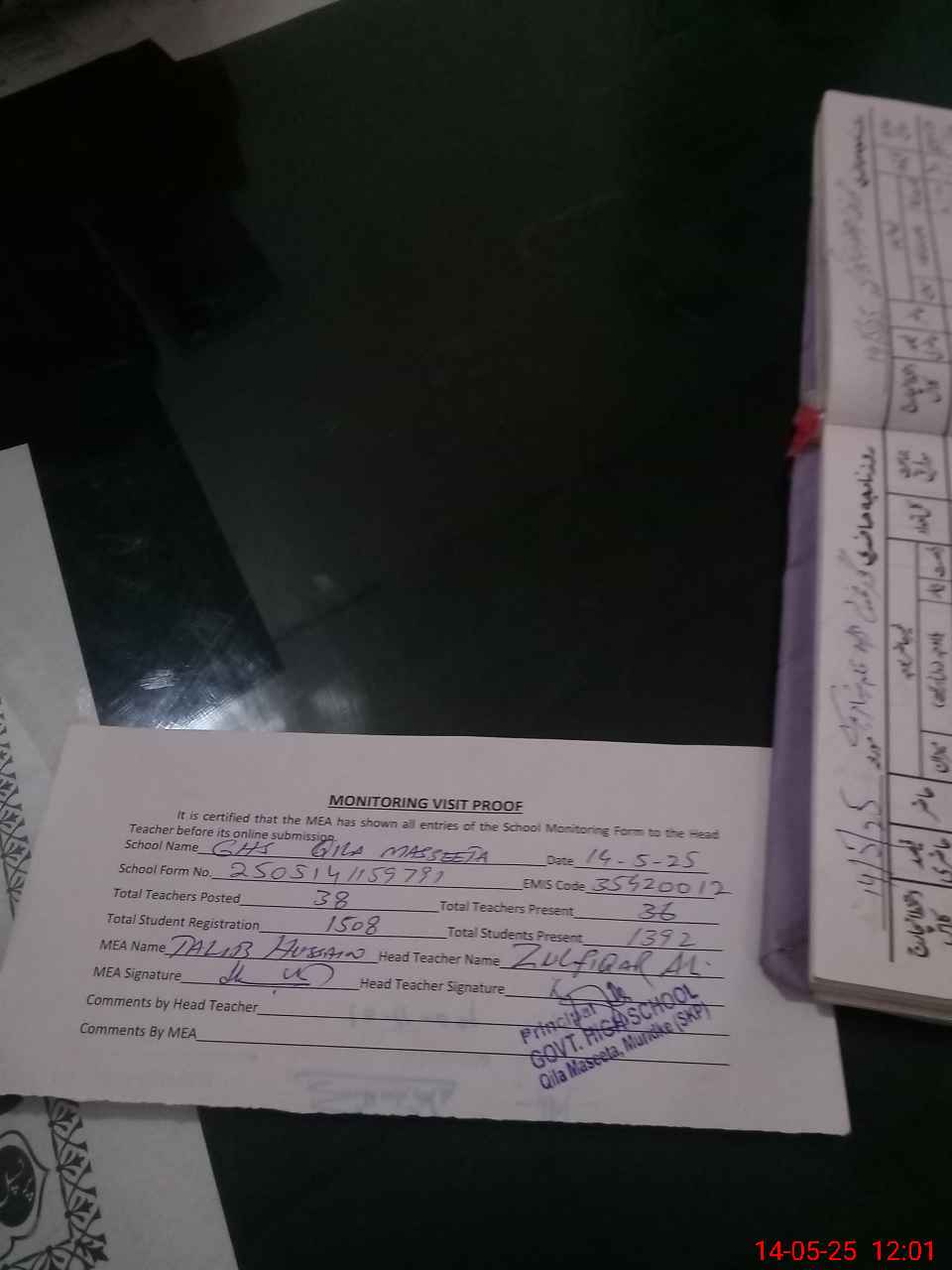 | Attendance Register | Head Teacher | MEA with School | Visit Proof |
