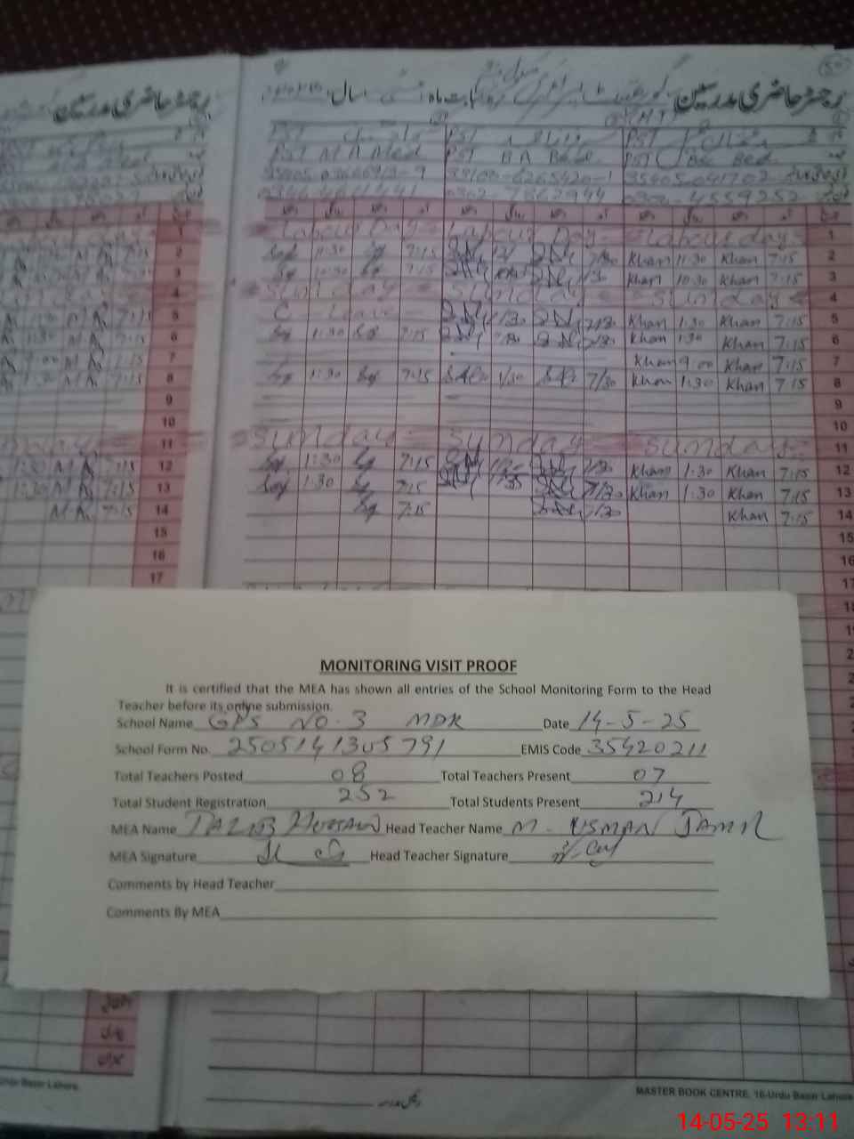 | Attendance Register | Head Teacher | MEA with School | Visit Proof |