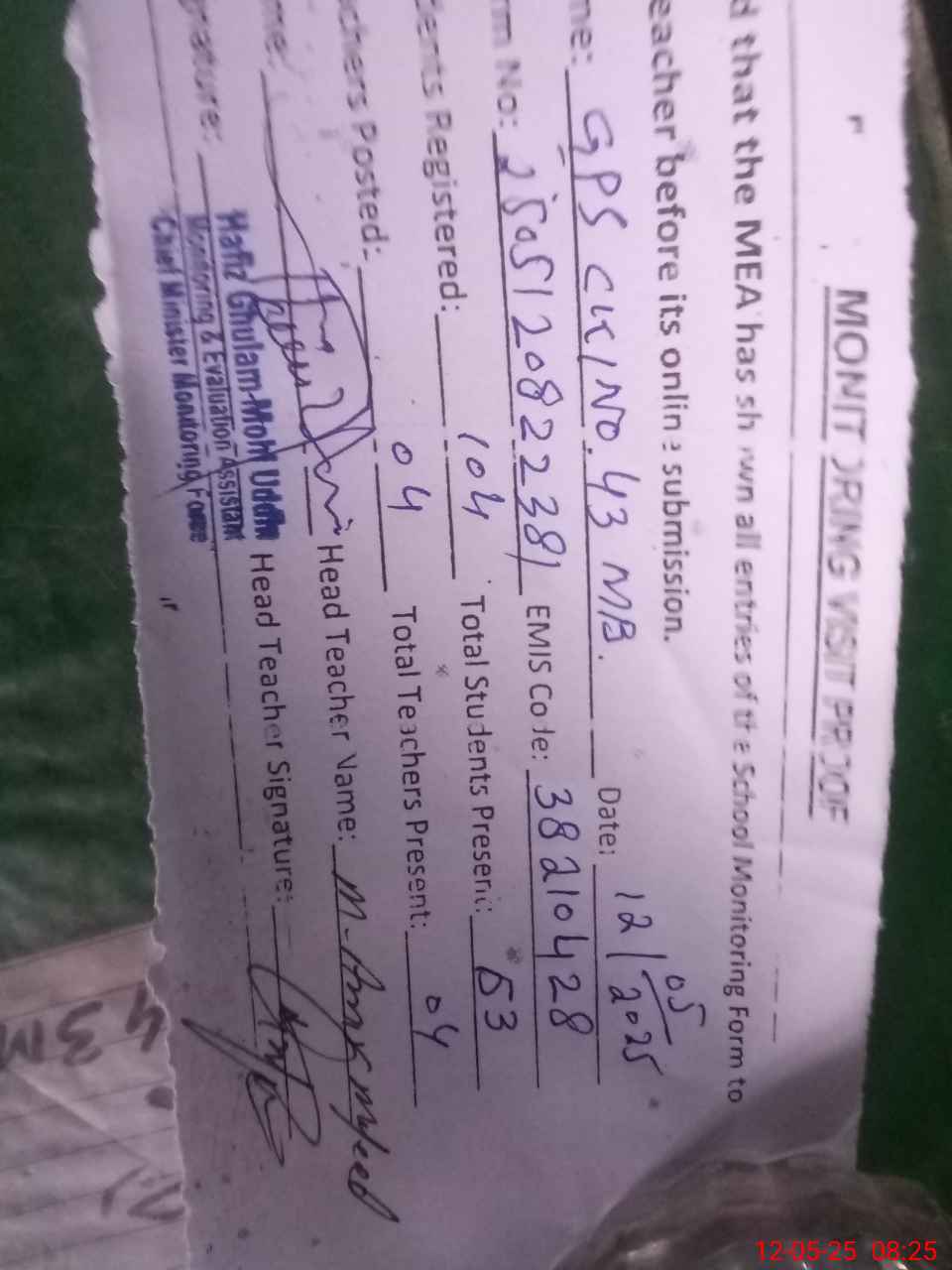 | EMIS Code: 38210428 | Name of School: GPS CHAK NO. 43 MB | |||