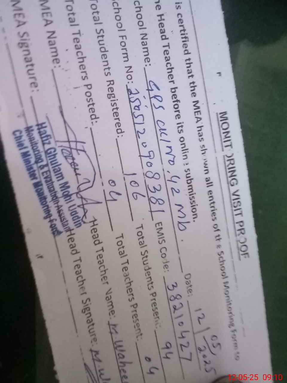 | Attendance Register | Head Teacher | MEA with School | Visit Proof |
