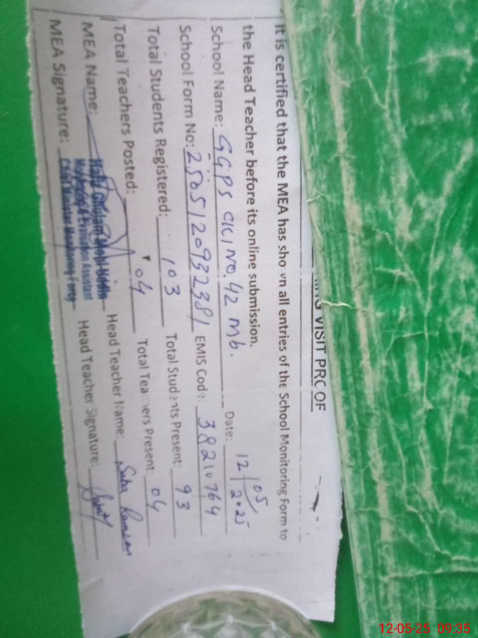 | Attendance Register | Head Teacher | MEA with School | Visit Proof |